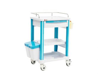 - Столешница оборудована бортиками и 3-х сторонним металлическим ограждением для удобного размещения высоких емкостей и флаконов, 2 полки с выпрессованными отбортовками оснащены специальными углублениями для медицинских инструментов и медикаментов